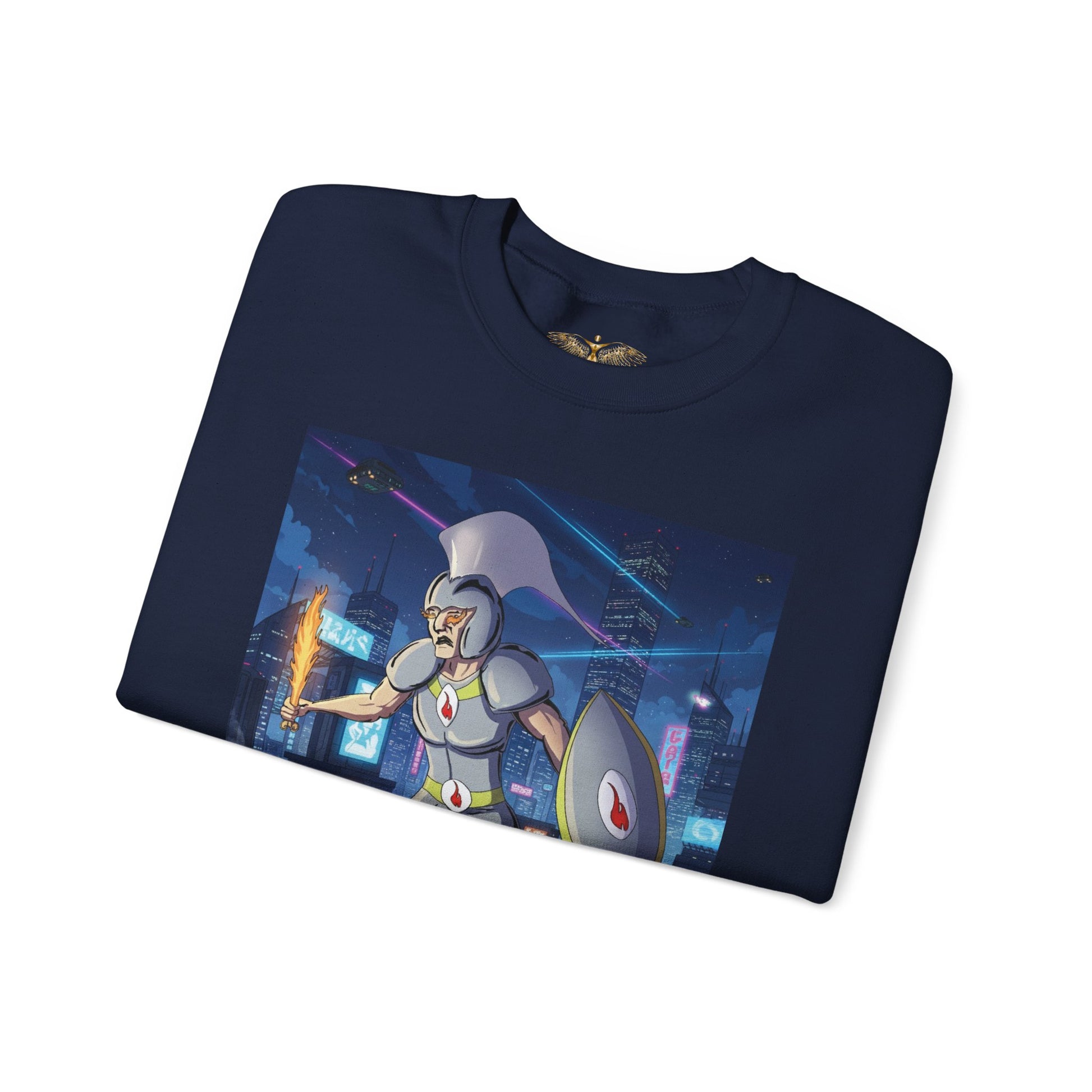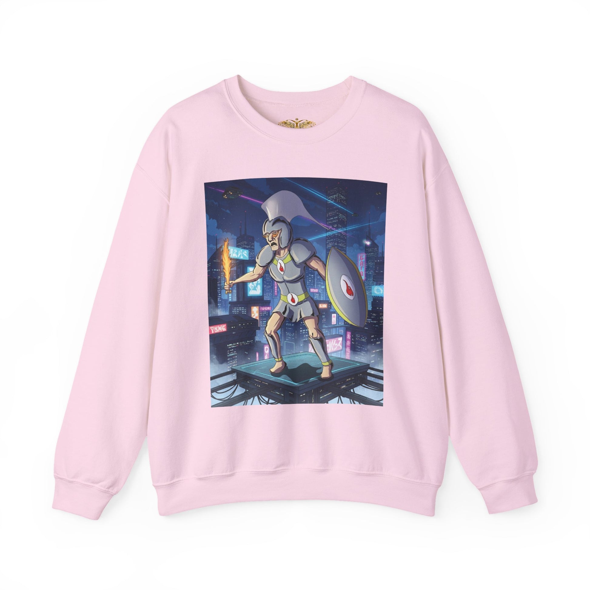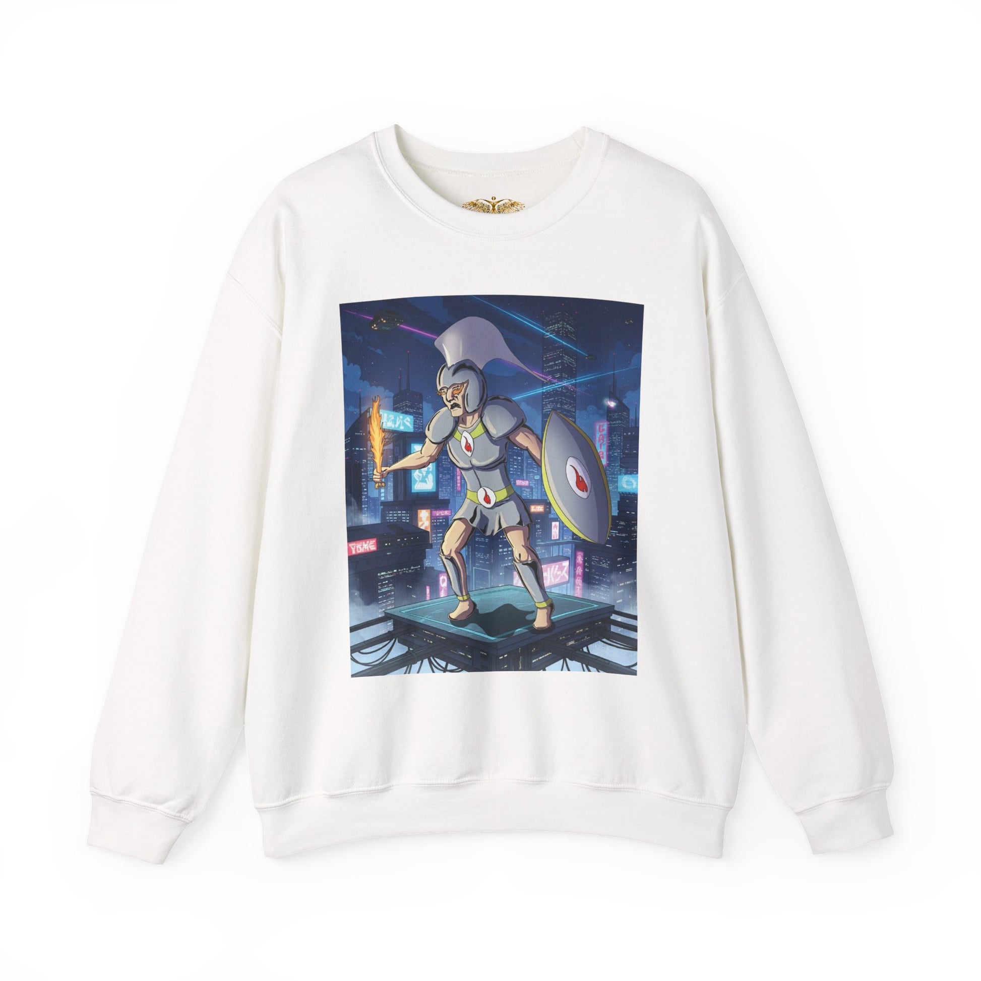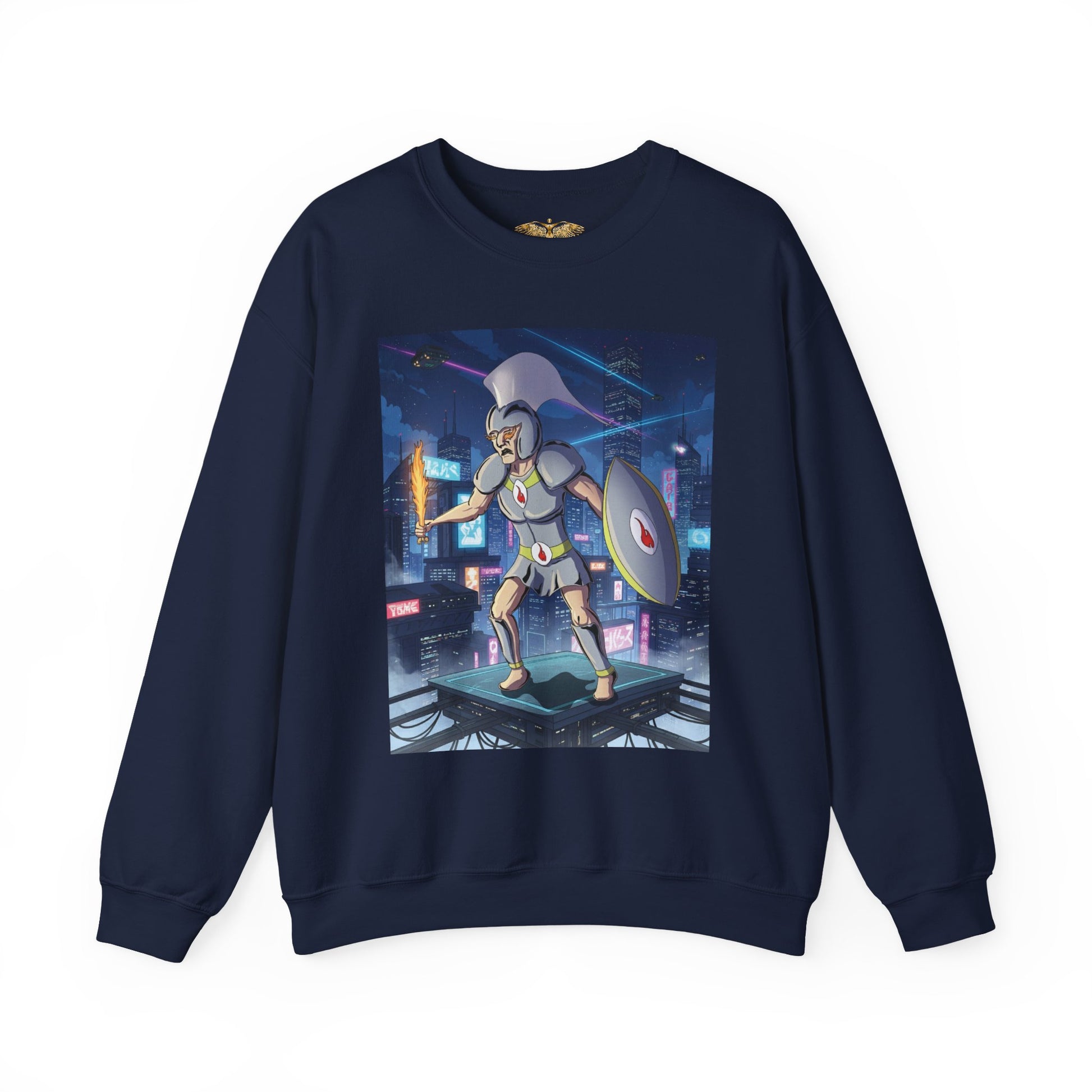 Solar Plexus Warrior Crewneck | Third Chakra Cyber Guardian Sweatshirt | Renato Unali Neon Hoplite Design