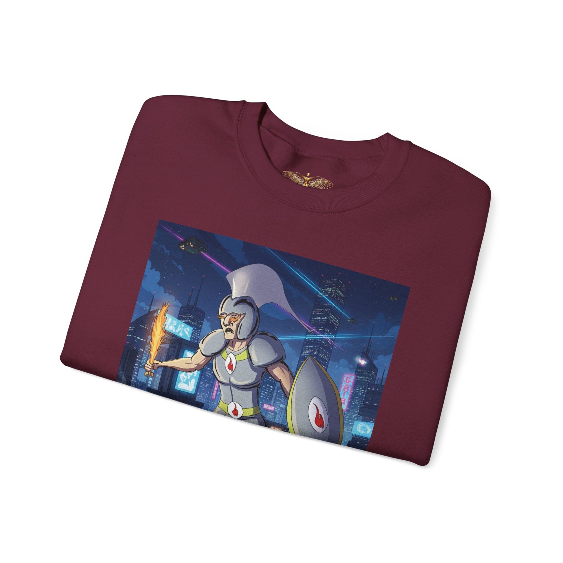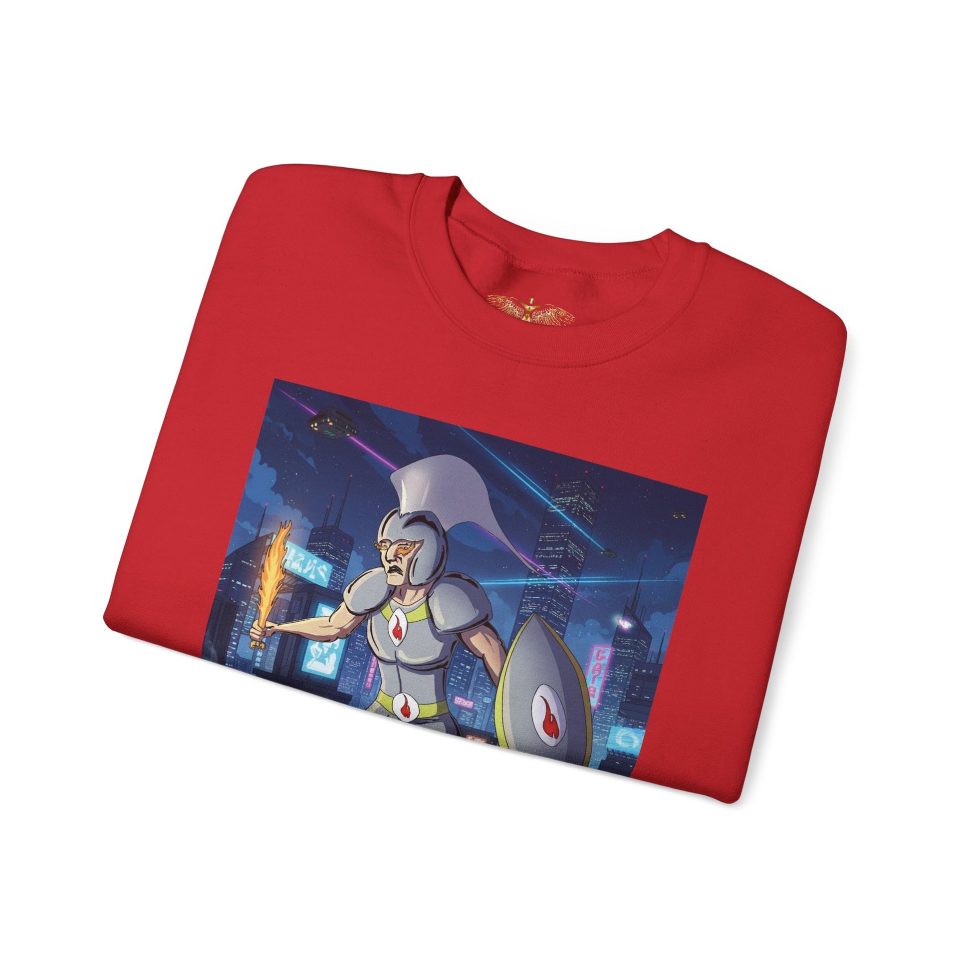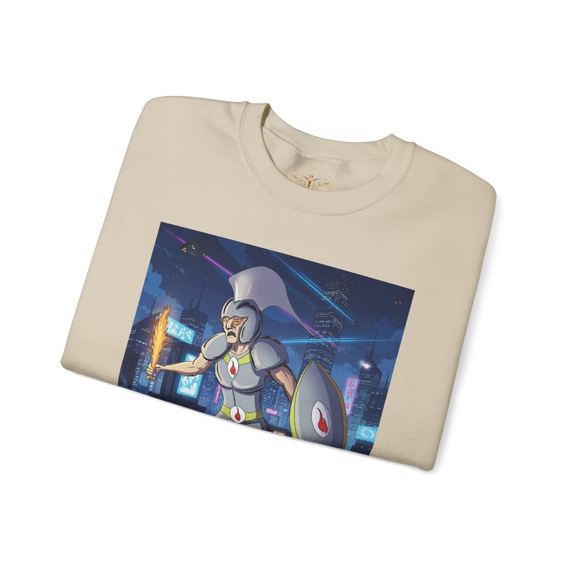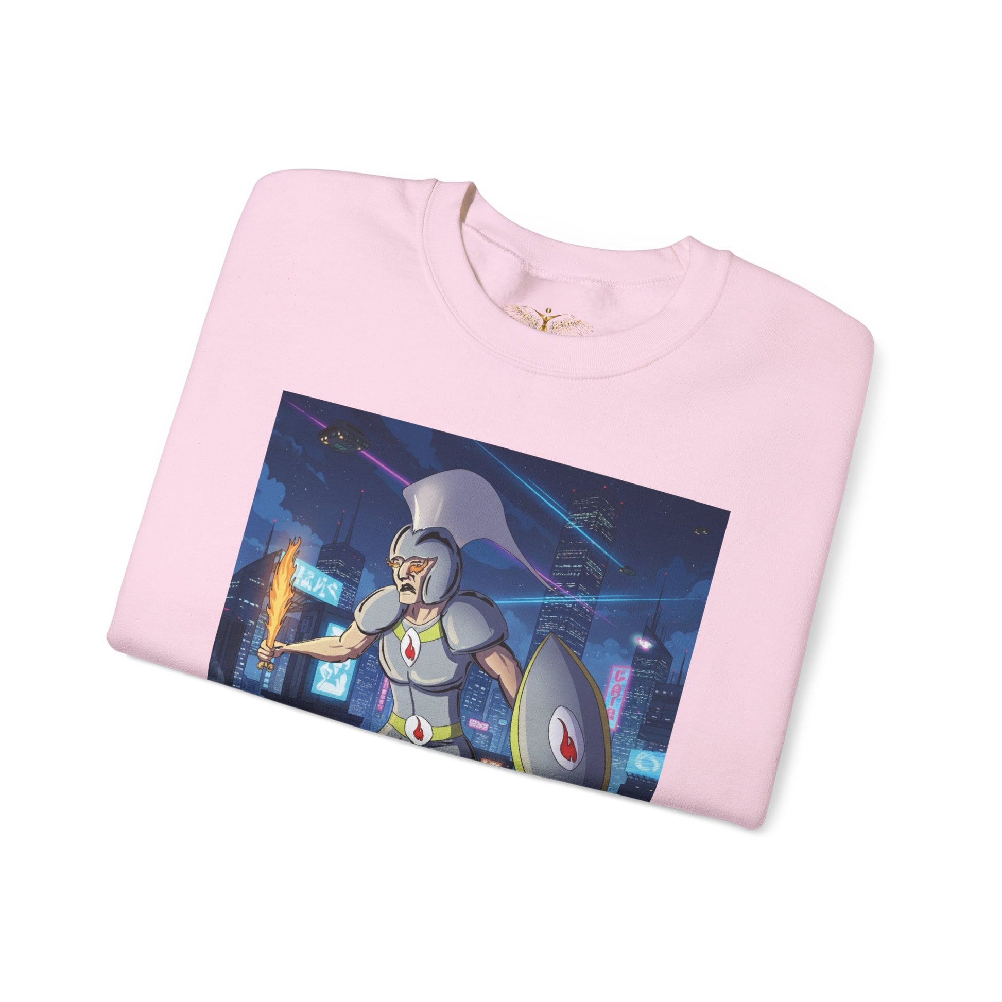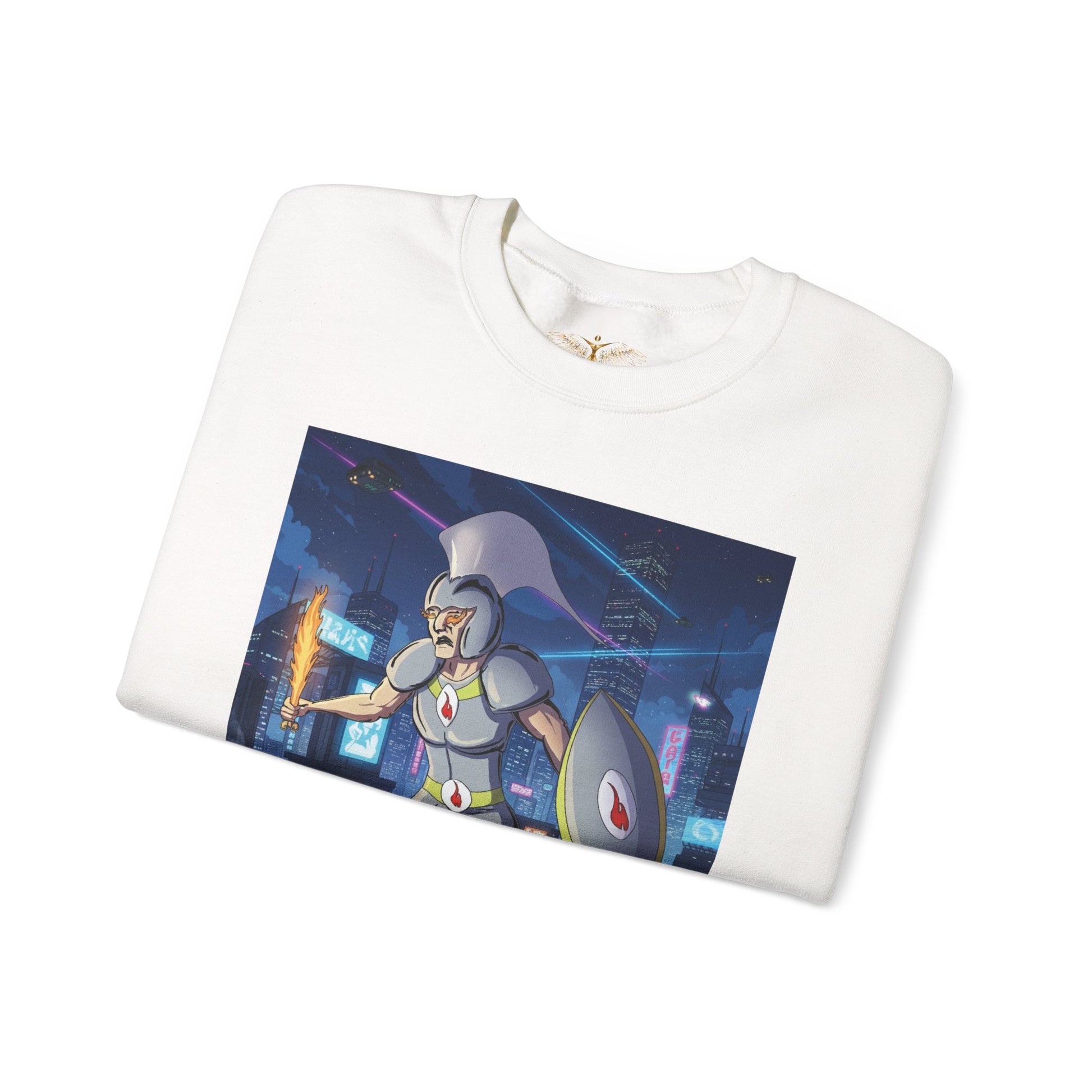 Solar Plexus Warrior Crewneck | Third Chakra Cyber Guardian Sweatshirt | Renato Unali Neon Hoplite Design