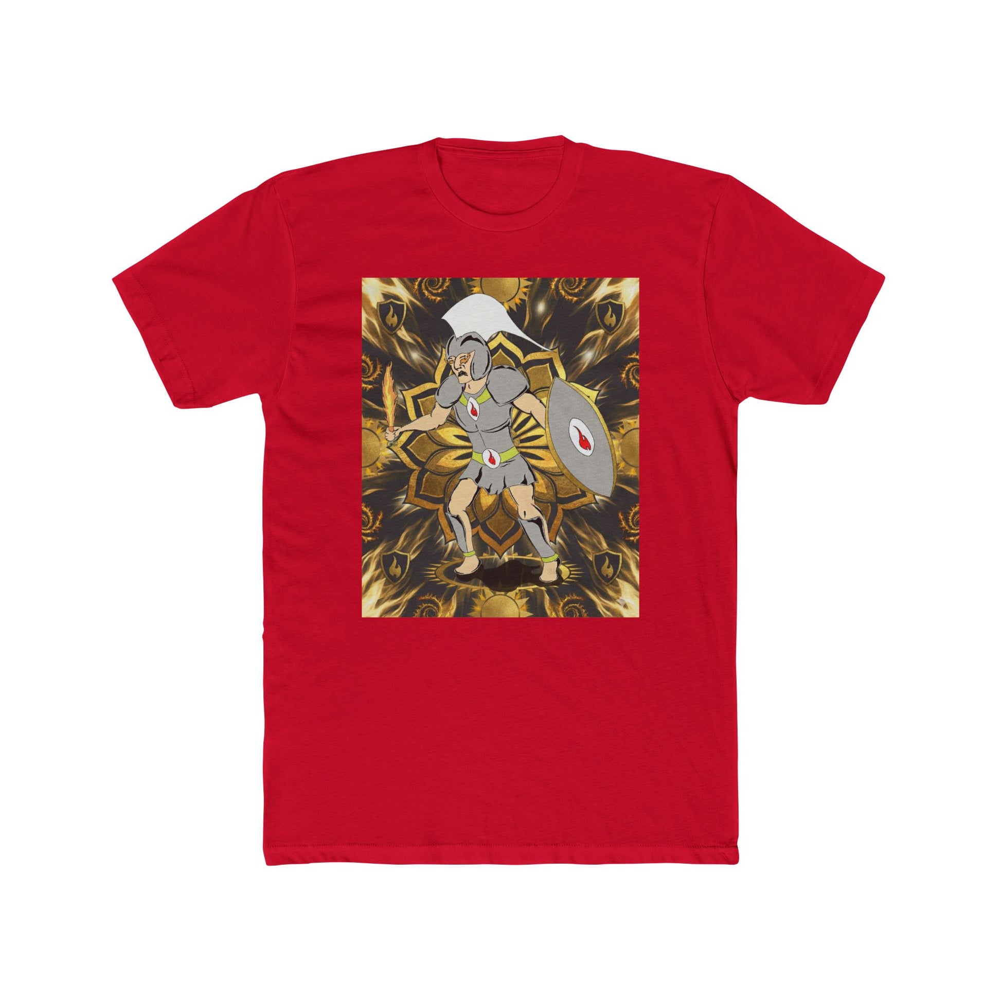 This lightweight cotton crew brings bold, battle-ready energy to your everyday wardrobe. The front print shows a stylized warrior with shield and helm layered over a rhythmic, metallic-gold pattern — it reads like motion frozen mid-clash. Wear it to channel a brash, confident vibe: it layers easily under a jacket or stands alone with jeans. The fit is classic and unforced, so the graphic stays front-and-center without looking bulky. Built with attention to construction — shoulder tape, side seams, and a ribbed knit collar — it keeps its shape through frequent wear and washings. Compliance-certified and backed by a two-year EU warranty, this tee blends standout art with a practical, durable build.