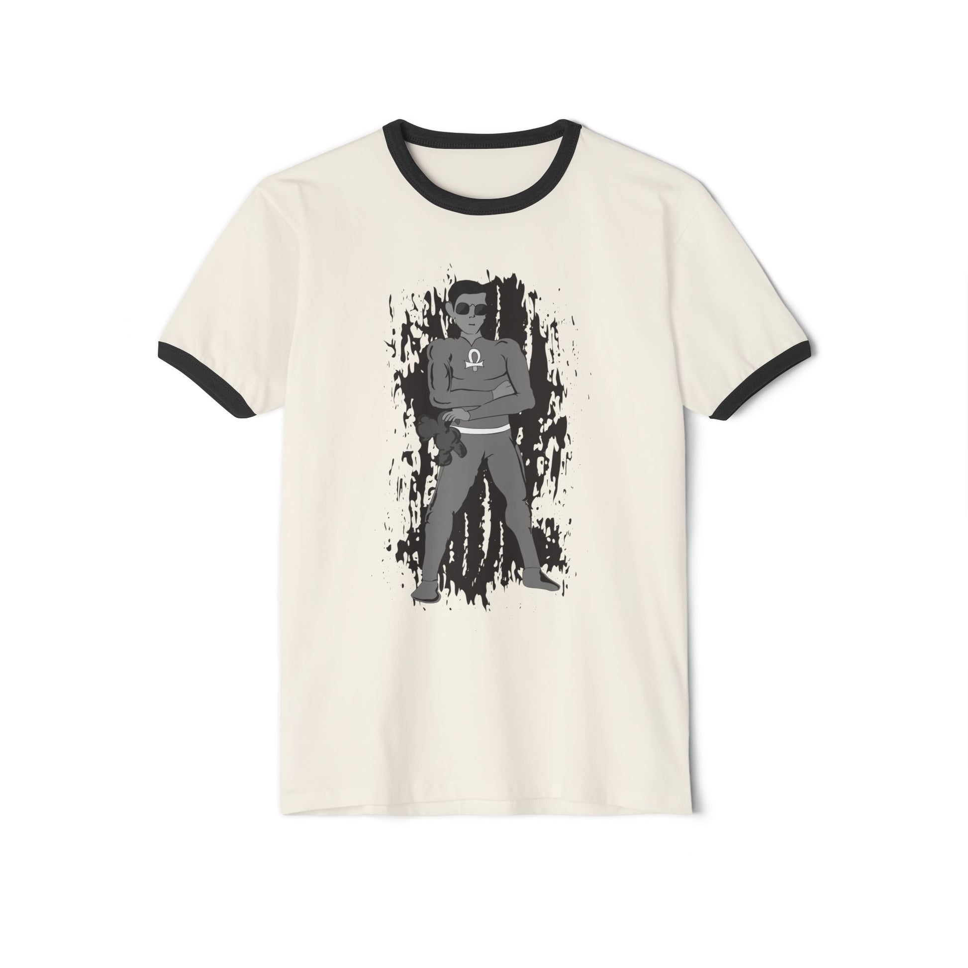 This soft, vintage-inspired ringer tee brings quiet confidence to everyday wear. The off-white body with dark contrasting collar and sleeve bands frames a bold monochrome graphic—an anchored figure standing with arms crossed against a distressed backdrop—giving the shirt a slightly worn, lived-in look. Lightweight combed ring-spun cotton drapes easily over the body for cool comfort on long days. It’s the kind of shirt you reach for when you want something low-key but with personality—great layered under a denim jacket or worn solo while grabbing coffee, heading to a casual meet-up, or walking the neighborhood at dusk. The classic fit and tear-away label keep the focus on comfort and the artful print, while side seams help the shape stay true wash after wash.