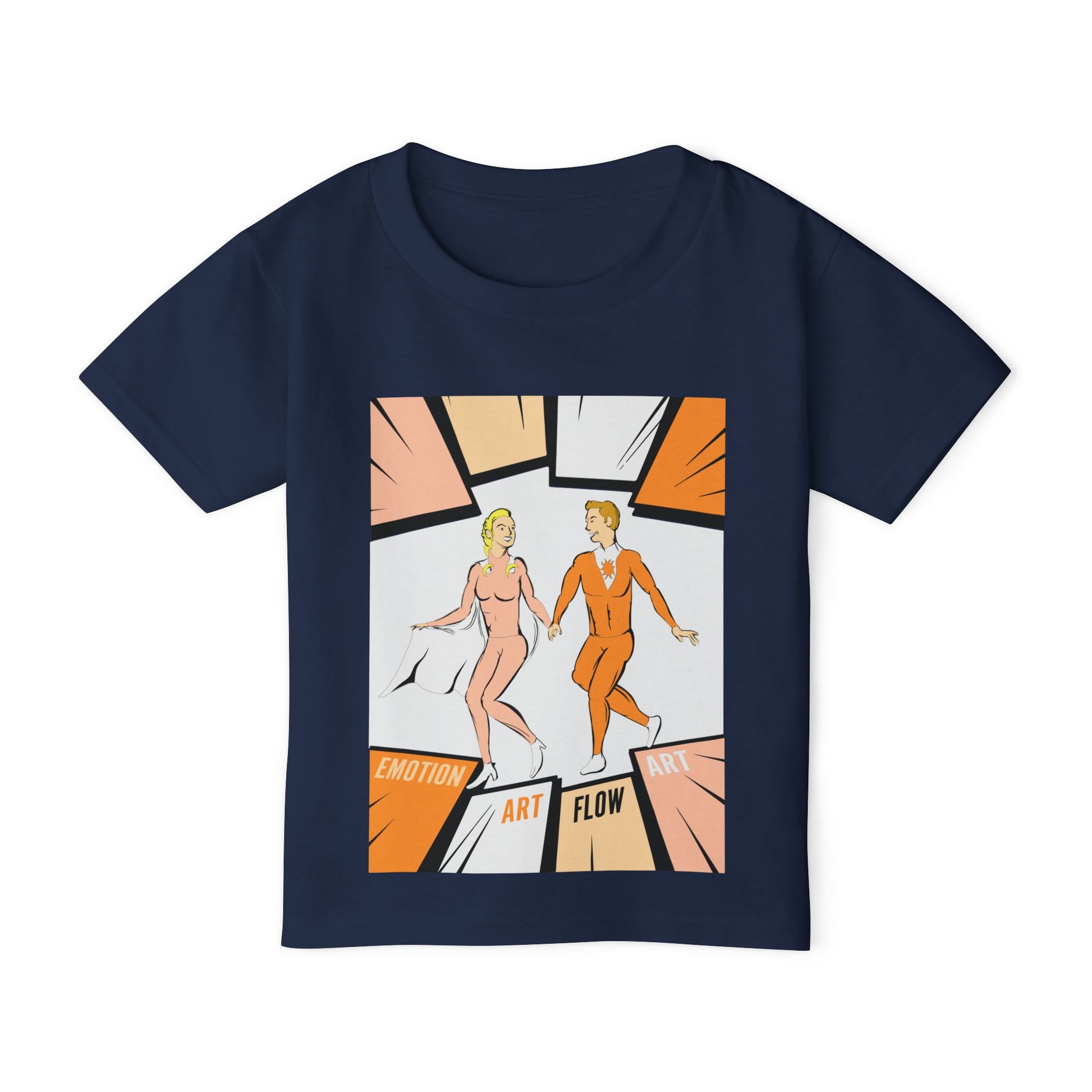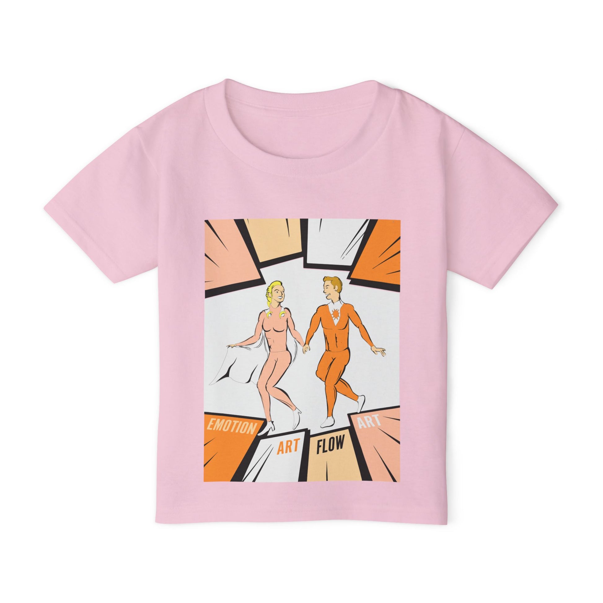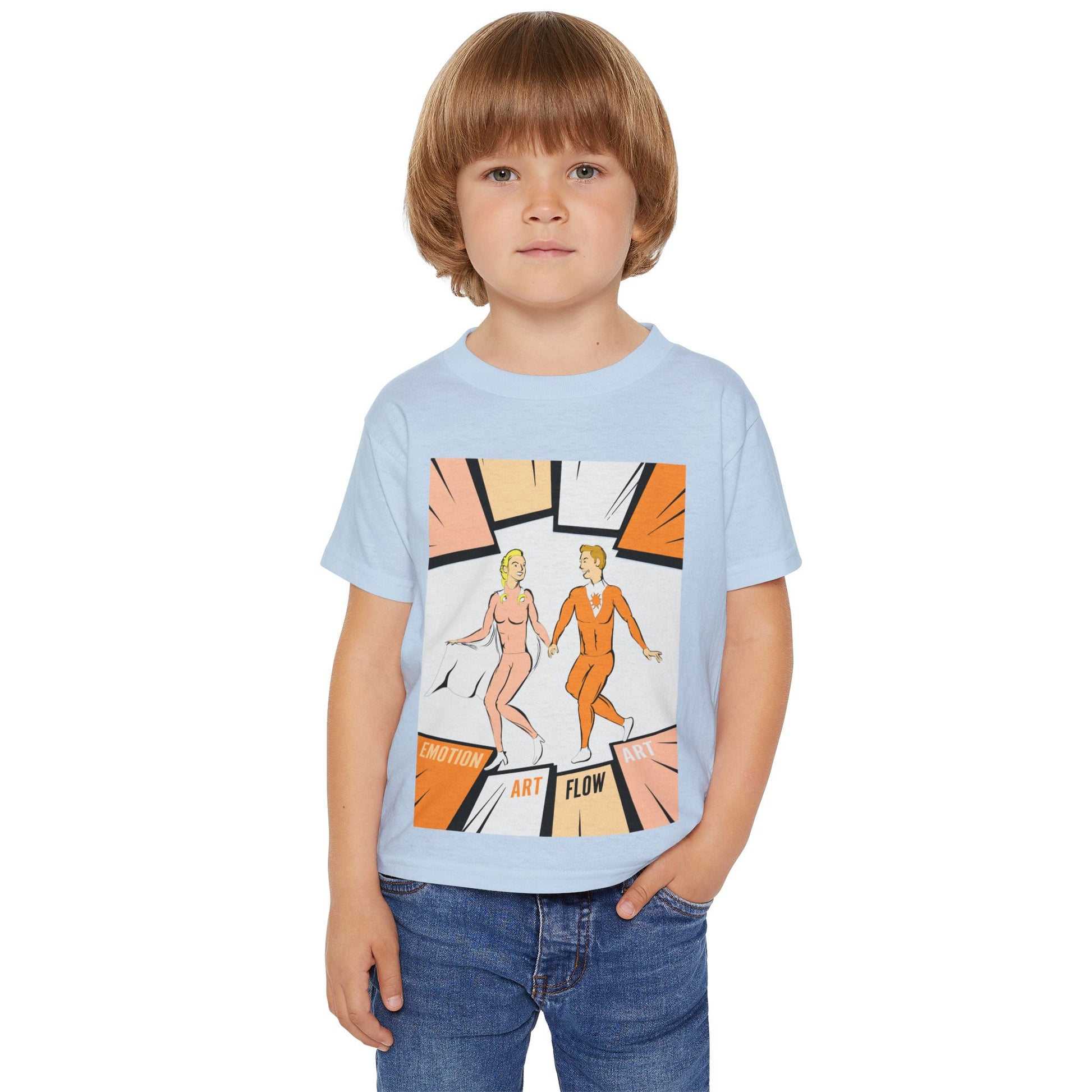 Bright, playful toddler tee that reads like a miniature comic panel—two stylized dancers move through bold orange and peach bursts while block text hints at creative energy. The medium-weight cotton holds the print’s vivid lines and keeps shape through play. It’s lively and lighthearted, built to withstand tumbles and hugs while showing off a love for movement and color. Slip it on for art class, weekend outings, or afternoons at the studio — it adds a cheerful, creative spark to a little one’s day.